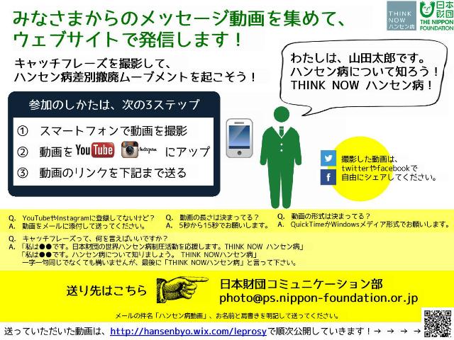 日本財団による活動詳細につきましては、下記をご覧ください。 日本財団ホームページ『ハンセン病の制圧に向けて』 http://www.nippon-foundation.or.jp/what/spotlight/leprosy/ 『「Think Now ハンセン病」動画を送ってください~あなたから1億人へのメッセージ』 http://www.nippon-foundation.or.jp/news/articles/2014/67.html |