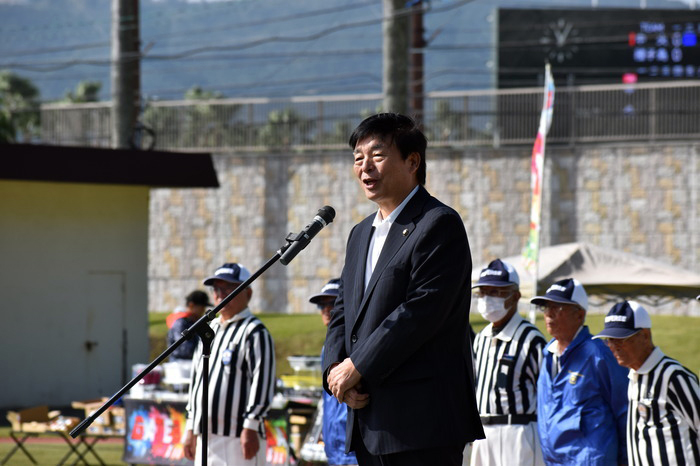 開会式で歓迎のあいさつをされる打越明司・指宿市長