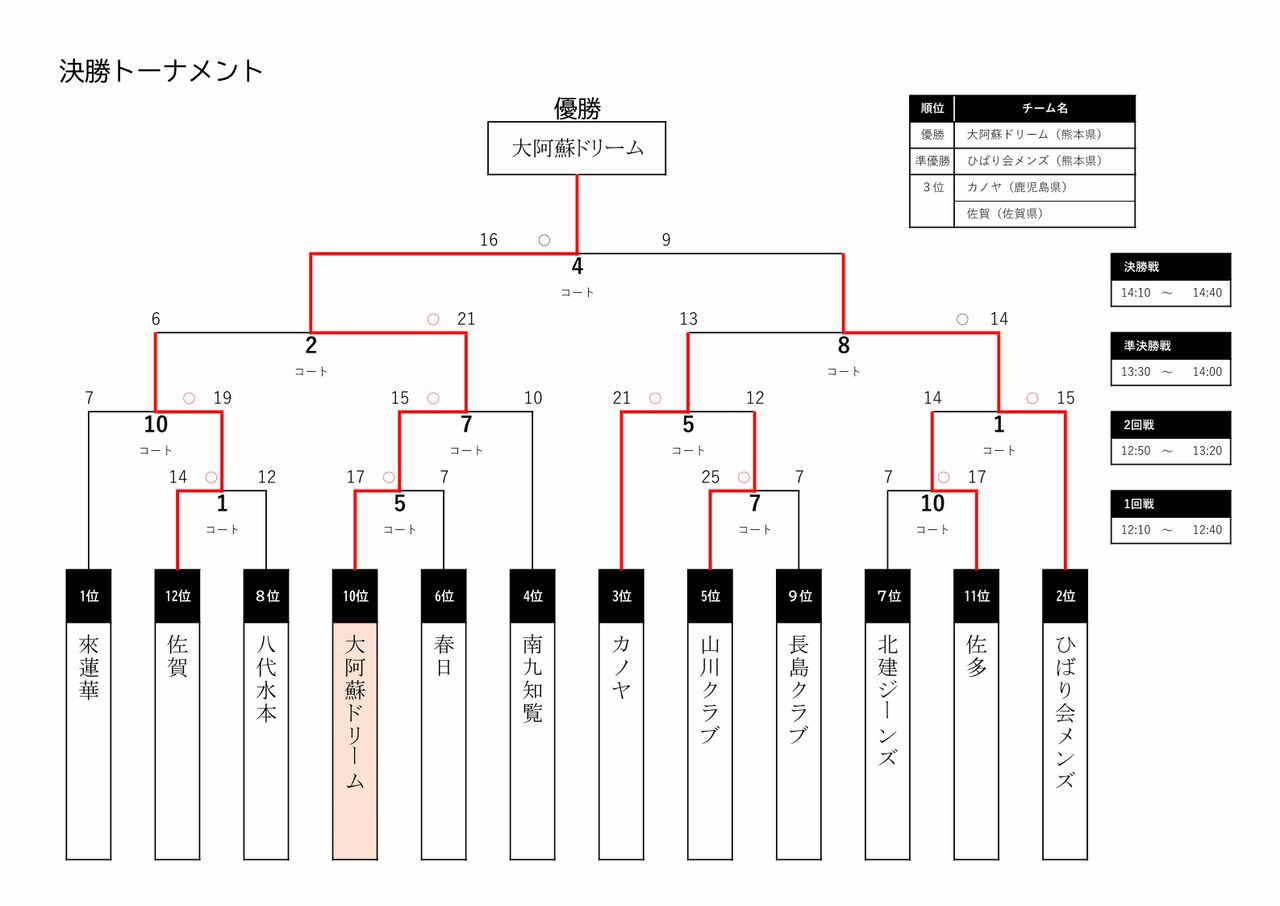 決勝戦は、平均年齢42歳のファミリーチーム・大阿蘇ドリームと、平均年齢73歳のシニア中心チーム・ひばり会メンズによる熊本県勢同士の対戦となりました。