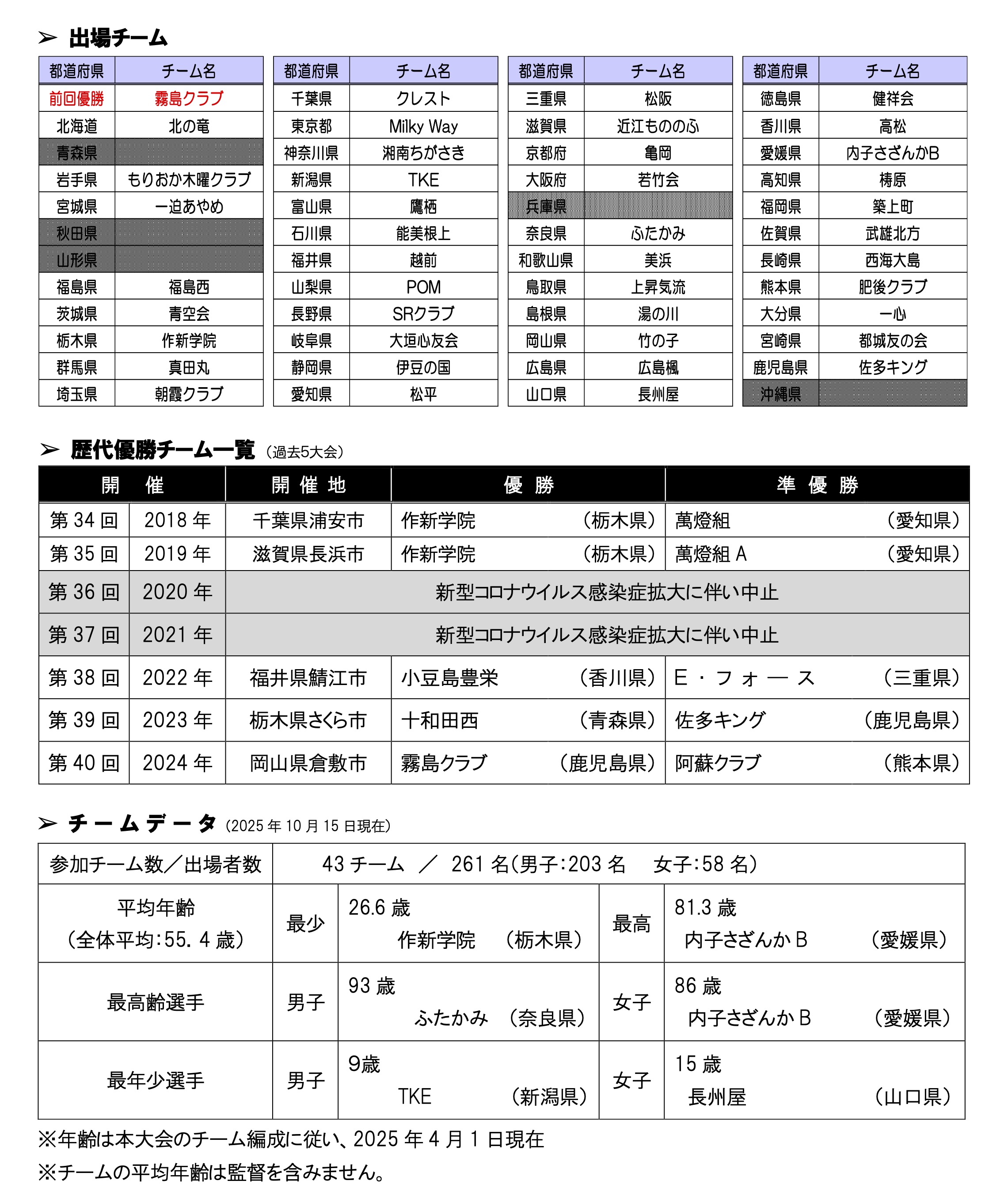 今大会には、前回優勝の霧島クラブ(鹿児島)と、全国の各都道府県予選会を勝ち抜いた43チーム・計261名(最年少9歳~最高齢93歳)が出場予定。