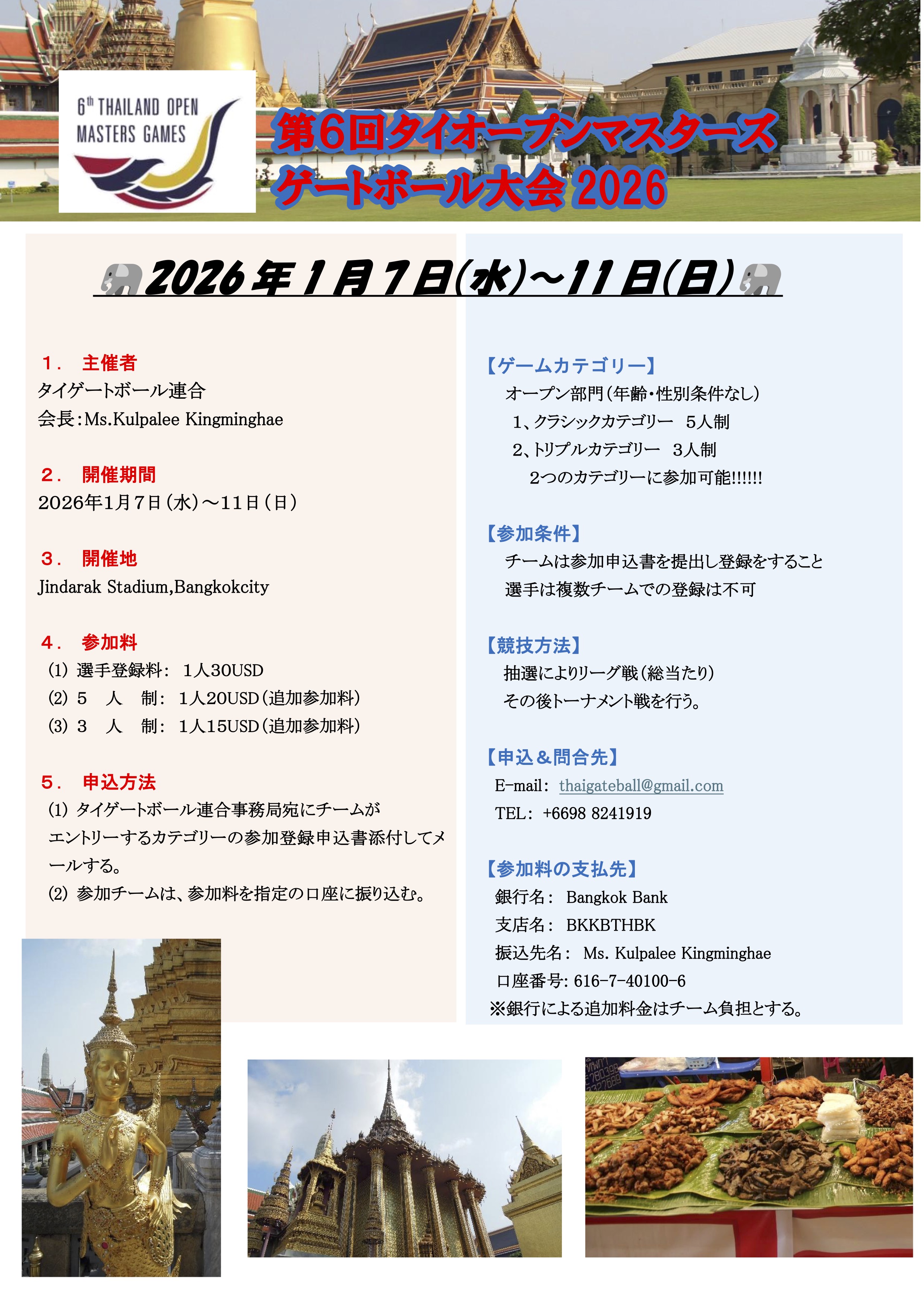 タイゲートボール連合主催の「第6回タイオープンマスターズゲームズ2026 ゲートボール大会」が、来年2026年1月7日(水)〜11日(日)にタイ・バンコク市のジンダラック・スタジアム(天然芝コート)で開催されます。