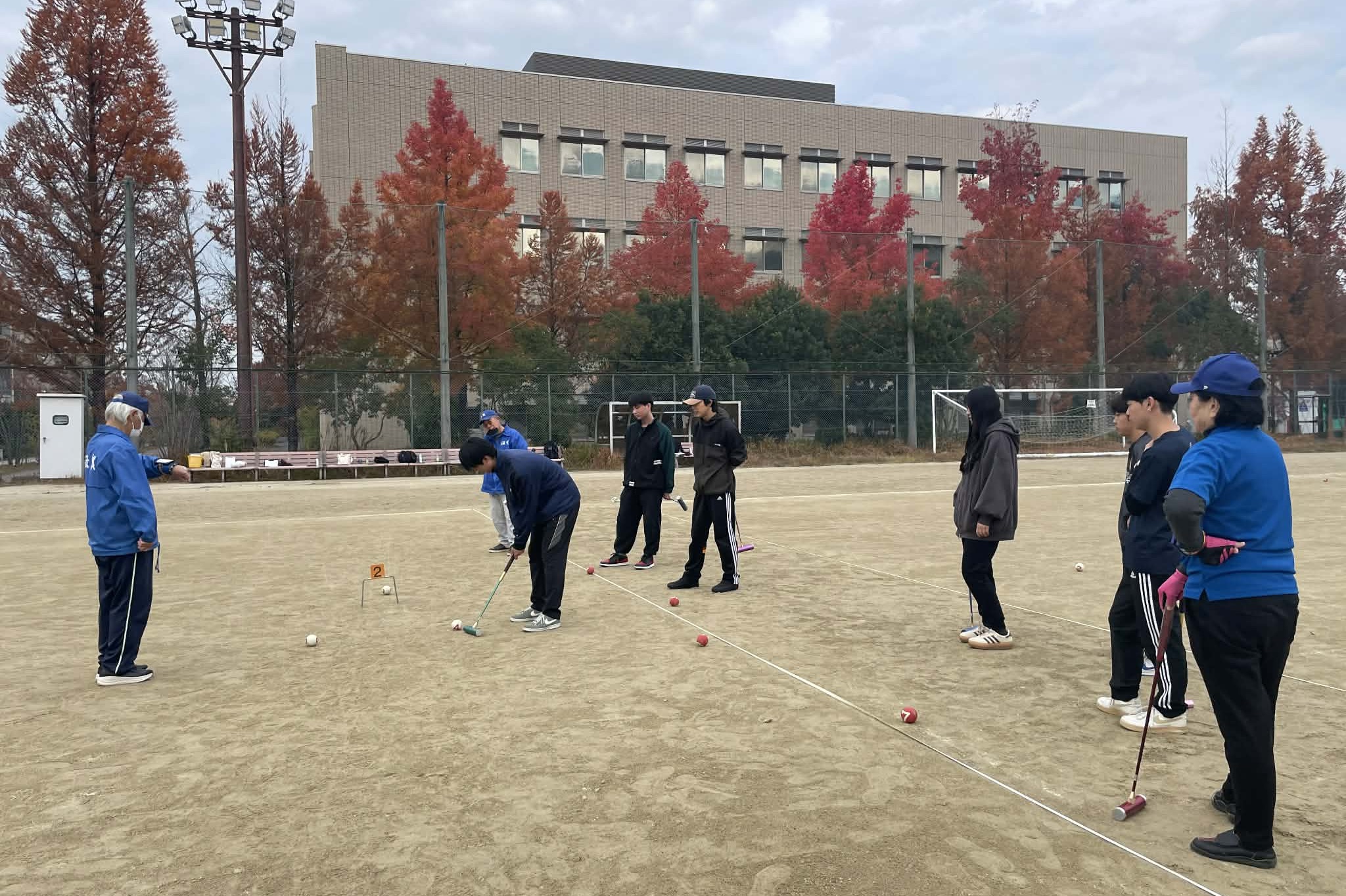 体験授業は11月6日・13日・20日・27日の木曜日に4週にわたり実施。1コマ目の授業(スポーツ方法実習)は学生20〜25名、2コマ目の授業(インクルーシブ体育・スポーツ実習)は5〜7名が受講し、各週とも、滋賀県ゲートボール連盟から9〜13名の指導者が協力したほか、最終週には県外から若手のゲストプレーヤーも協力しました。