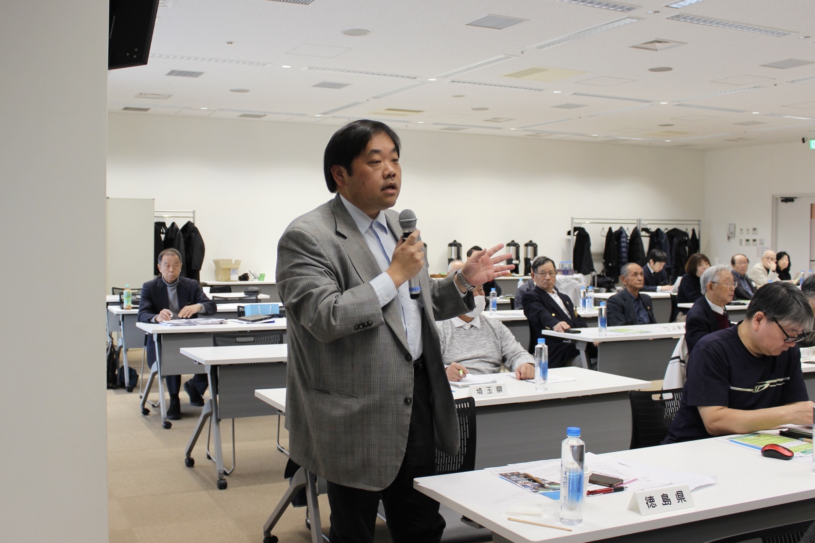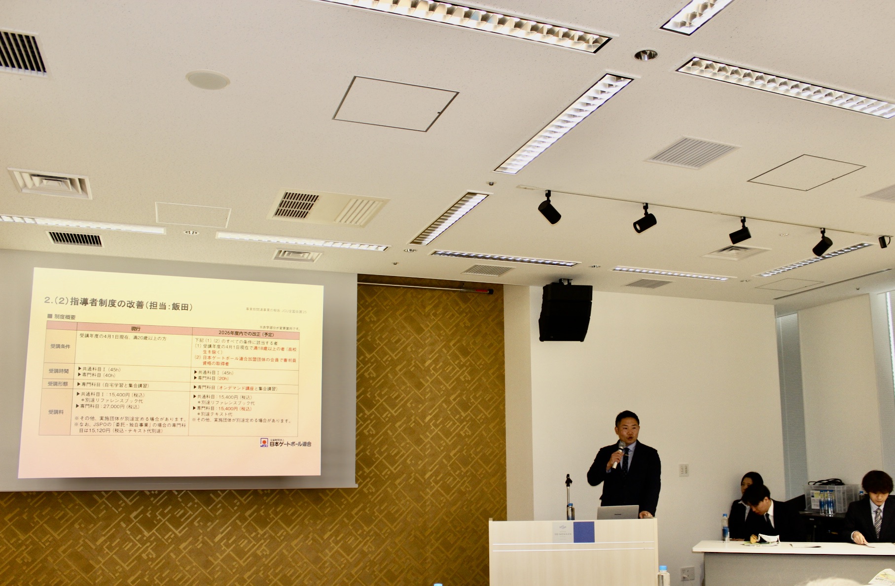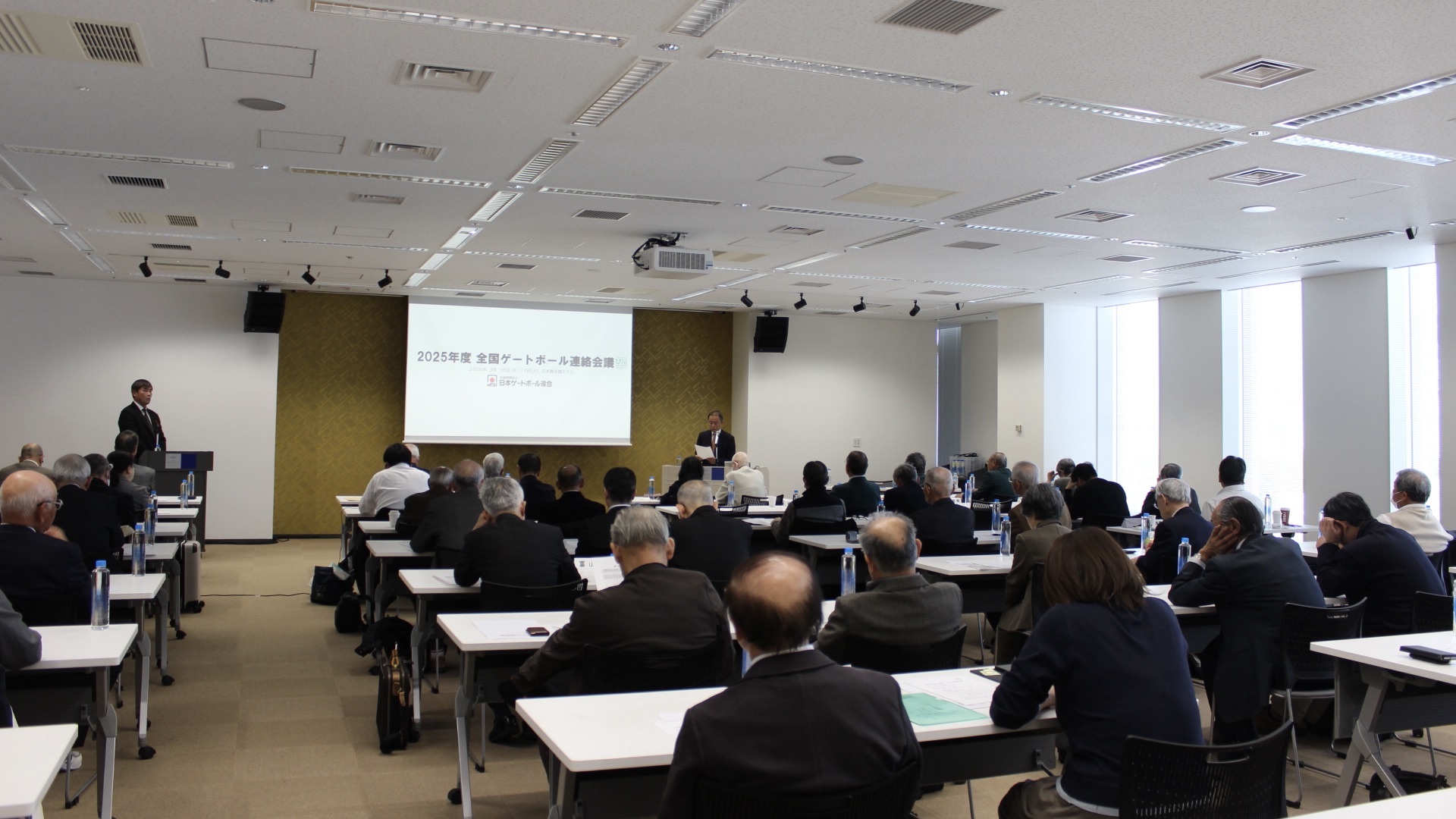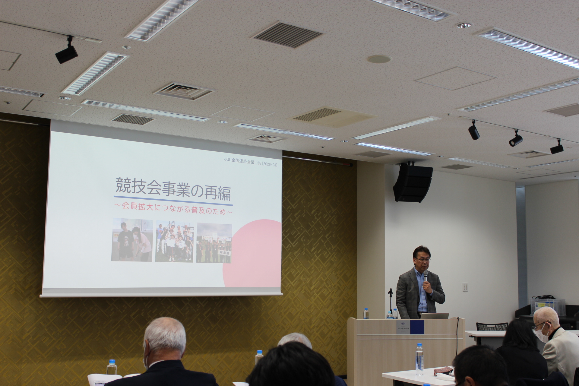 2日目は、総務部からの事務連絡に続き、事業部より2025年度事業報告および今後の事業展開について説明が行われました。あわせて、2027年5月15日(土)〜17日(月)に京都府で開催される「ワールドマスターズゲームズ2027関西🔗」の案内も行われ、会場ではPR動画が上映されました。